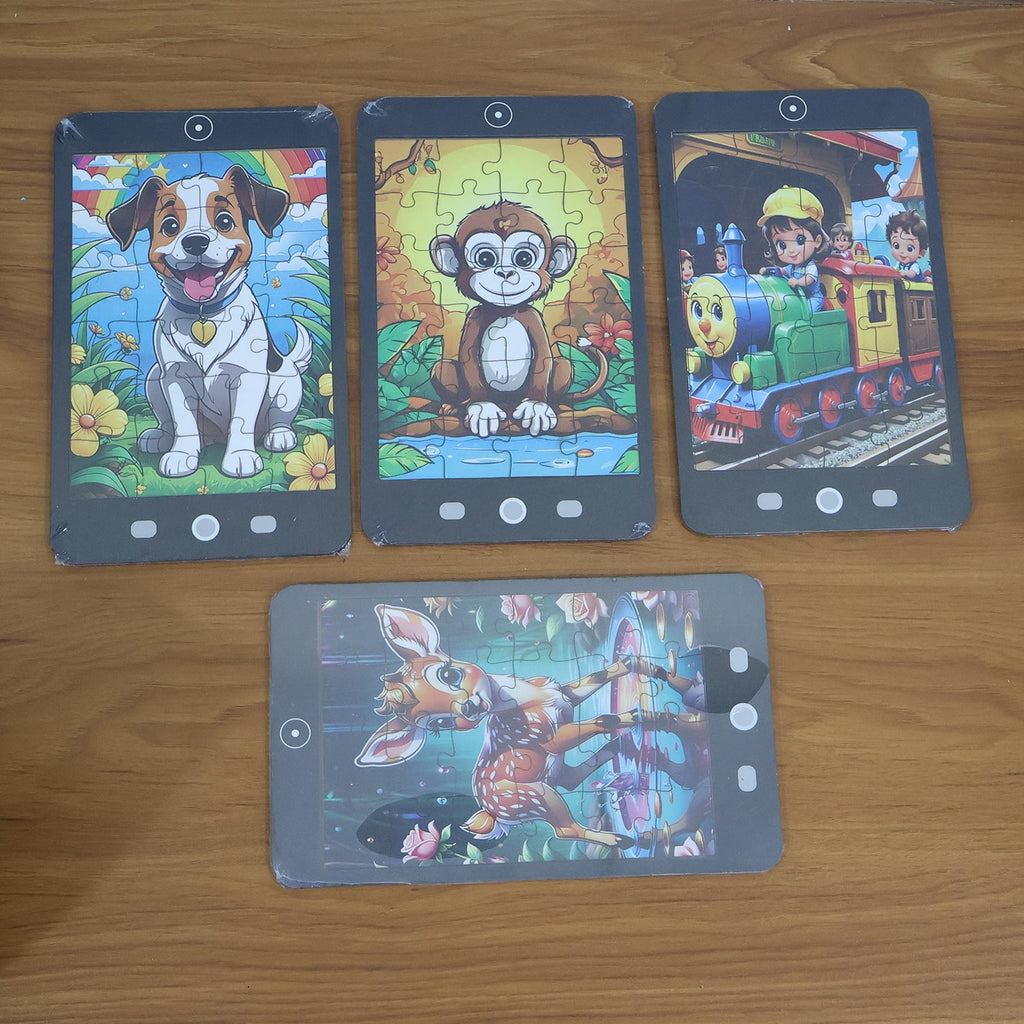 Kids Mini Cartoon Jigsaw Puzzle – 1 Pc Mix Design Mobile-Phone Shaped Puzzle Board (Dog/Monkey/Deer/Train) | Educational Learning Toy for Toddlers & Kids | Portable Travel Brain Game | Safe Thick Cardboard